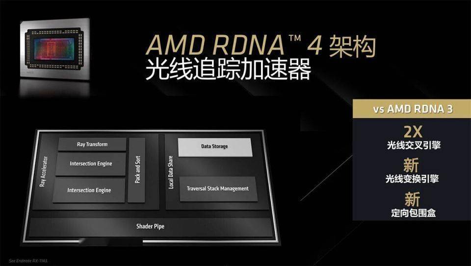 全新的RDNA 4架构引入了第三代光线追踪加速器,使得光线提升了两倍。第二代AI加速器不仅提升了FP16、INT8的算力,还引入了对FP8的支持。也得益于这个FP8支持,FSR 4才得以实现。