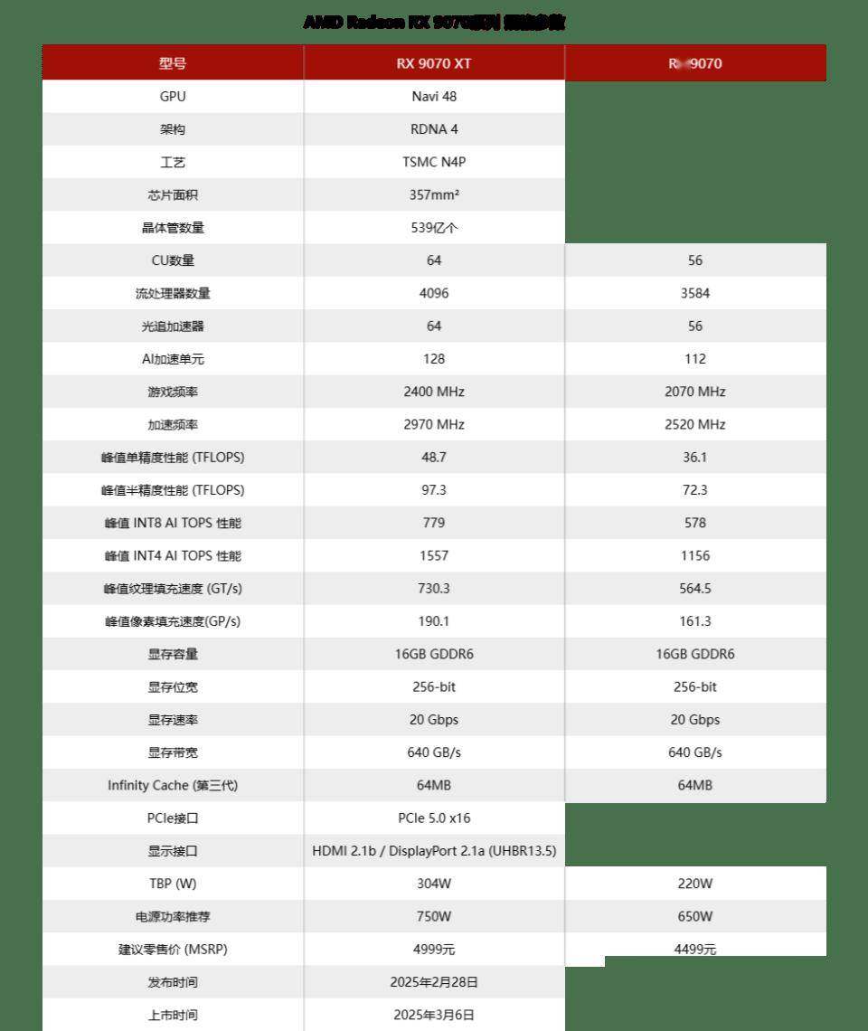 回到显卡本身,RX 9070 XT和RX 9070都是基于Navi 48核心打造,只是前者是完整的64个CU,后者是56个。此外,RX 9070 XT的核心频率也更高。不过显存上两张显卡没什么区别,都是16GB GDDR6。