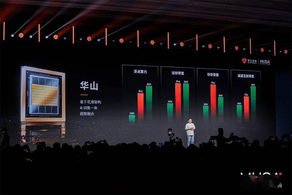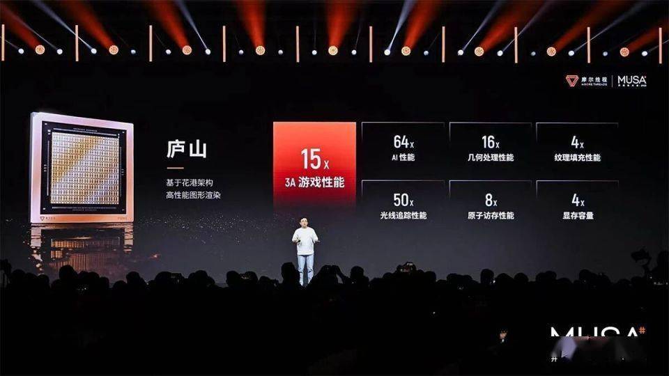 基于“花港”架构,摩尔线程公布了未来将发布的两款芯片:第一款是专注AI训推一体与超大规模智能计算的“华山”。它集成了新一代异步编程与全精度张量计算单元,支持从FP4至FP64的全精度计算,为万卡级智算集群提供了稳定高效的算力支撑。第二款则是专攻图形的“庐山”,它的AI计算性能提升64倍,几何处理性能提升16倍,光线倍,并显著增强纹理填充、原子访存能力及显存容量。