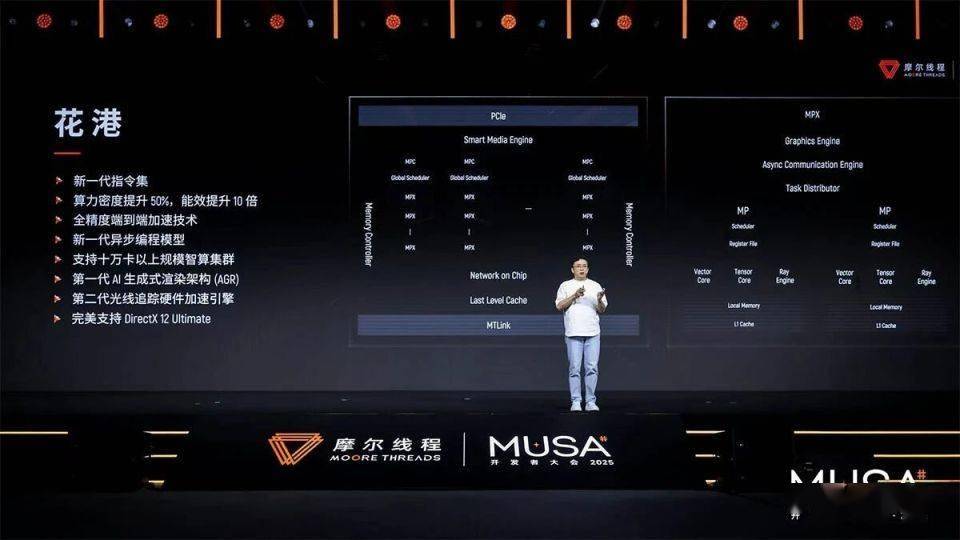 在2025年快结束的时候,摩尔线程召开了首届MUSA开发者大会。在大会上,摩尔线程公布了一系列重大突破:首先是全功能GPU架构“花港”,该架构基于新一代指令集打造,算力密度提升50%,能效大幅优化,且支持的AI运算格式更多。在图形方面,“花港”内置AI生成式渲染架构,增强了硬件光线追踪加速引擎,并完整支持DirectX 12 Ultimate。