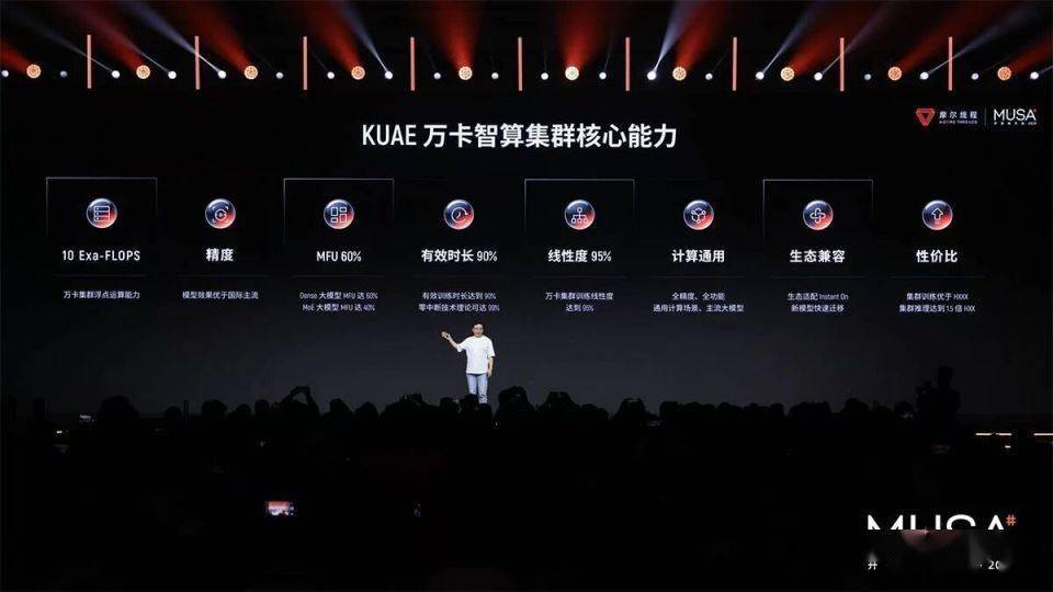具体的硬件方面,摩尔线程发布了夸娥万卡智算集群。该集群具备全精度、全功能通用计算能力,可在万卡规模下实现高效稳定的AI训练与推理,其核心突破包括:浮点运算能力达到10Exa-Flops,训练算力利用率(MFU)在Dense大模型上达60%,MOE大模型上达40%,有效训练时间占比超过90%,训练线%,与国际主流生态高度兼容,并在多项指标上具备显著能效优势。