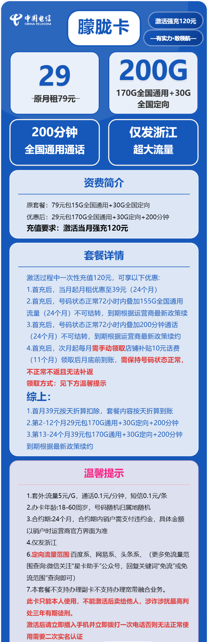 这款卡的优惠政策非常有吸引力,原月租79元,首充120元后能享受两年的优惠,小韩聊卡实测后发现,优惠没有任何套路。首充后次月起,每月手动领10元线元,这个价位在浙江电信29元流量卡里,流量和通话的配置都是天花板级别;第13-24个月,补贴结束后月租恢复到39元,套餐内容不变,依旧是200G流量+200分钟通线元流量卡,这个配置也远超同价位套餐,而且两年的优惠期,在浙江电信长期流量卡里,优惠持久度很高。