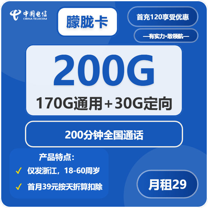 电信朦胧卡的套餐内容线G全国定向流量,总流量200G,还有200分钟全国通用通话,小韩聊卡实测下来,这个配置在浙江电信流量卡里算是第一梯队的。170G的通用流量,每天刷短视频、打手游、用办公软件处理工作,一天用6-7G,一个月也用不完,完全能满足追剧党、游戏党的大流量需求;30G定向流量覆盖上百款APP,刷视频的时候走定向流量,更省通用流量;200分钟通话也能满足日常和家人、同事的沟通需求,不用额外办通话套餐,不管是学生党还是上班族,都能满足全场景使用。