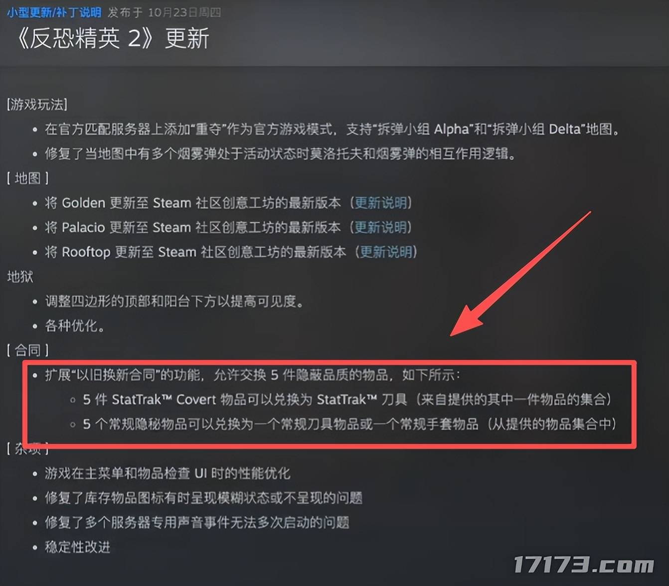 10月23日,《CSGO》突发重大新闻,V社更新“以旧换新合同”扩展功能,允许玩家用五个红色枪皮兑换更难出的刀皮和手套。