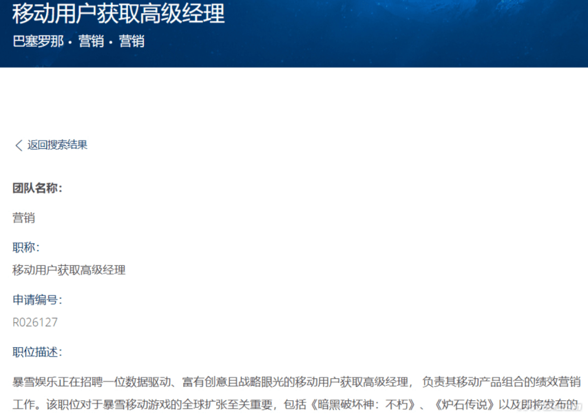 转机出现在10月中旬,暴雪巴塞罗那团队突然发布一则“移动用户获取高级经理”招聘启事,职位要求具备5年以上移动游戏用户获取经验,或10年以上数字营销背景,且有成功管理百万美元级预算、在全球范围内扩展手游用户规模的实操能力。